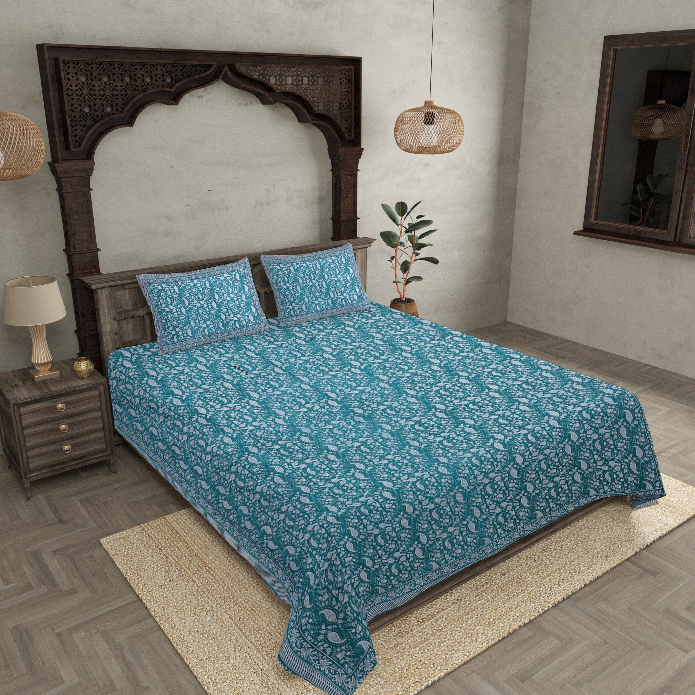 Double Bedsheet Sea Green Blue Paisley Floral Pattern