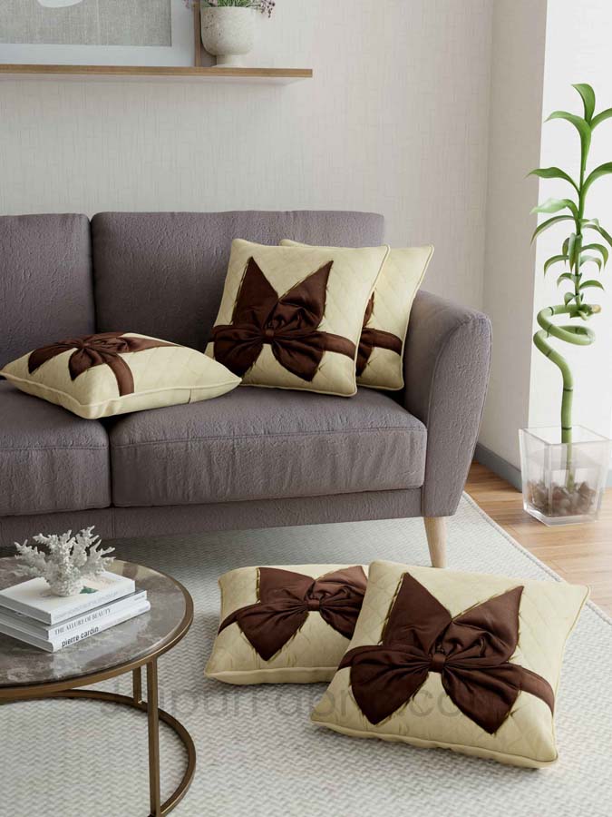Elevate your living space with the elegant Beige Brown Bow Tie Square Cotton Cushion Cover. This chic and stylish cushion cover features a bow tie design, perfect for adding a sophisticated touch to your home décor. Handcrafted from premium taffeta silk, it ensures both comfort and luxury.