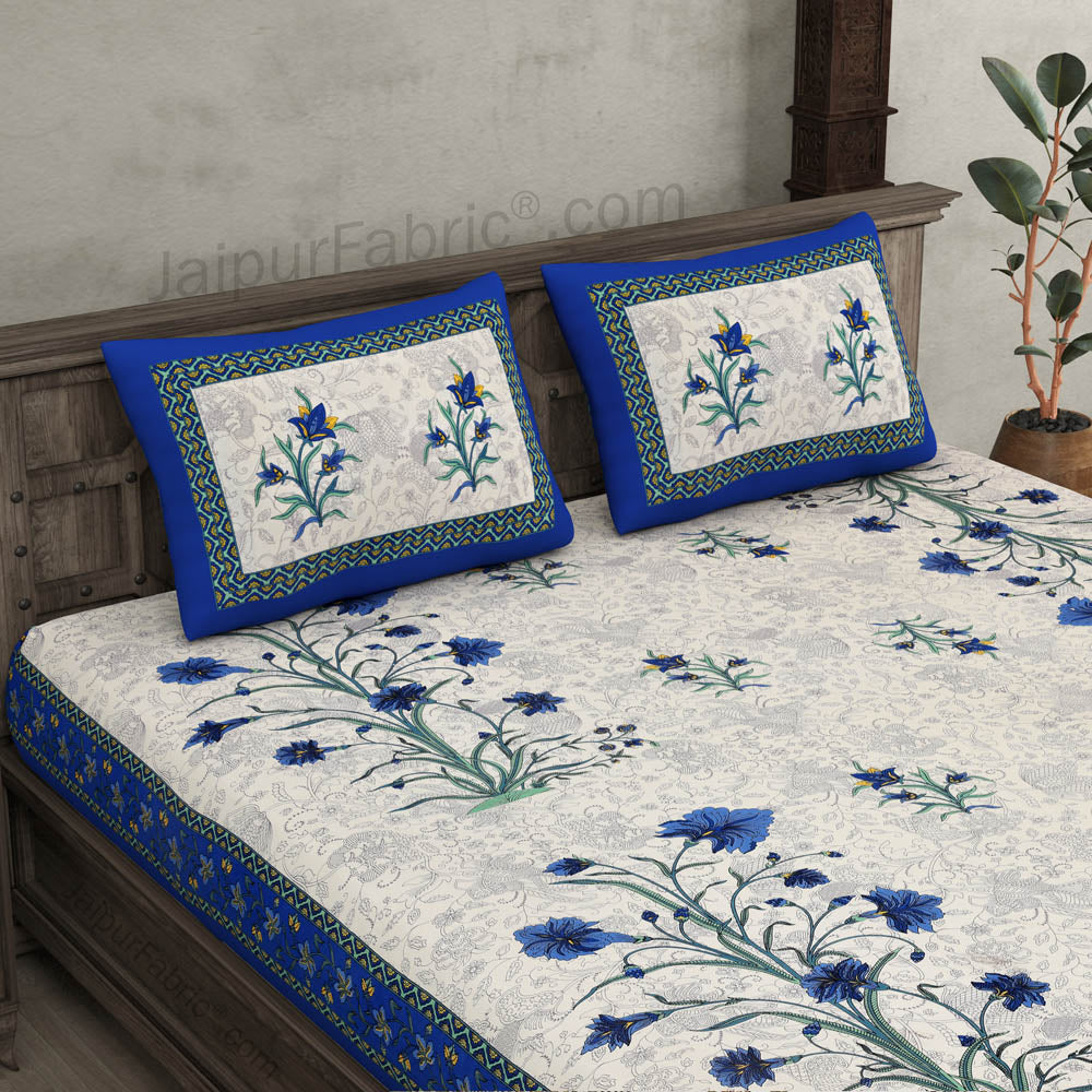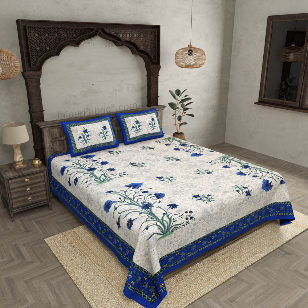 Blue Border Cream Base Bud And Tree Print Cotton Double Bed Sheet