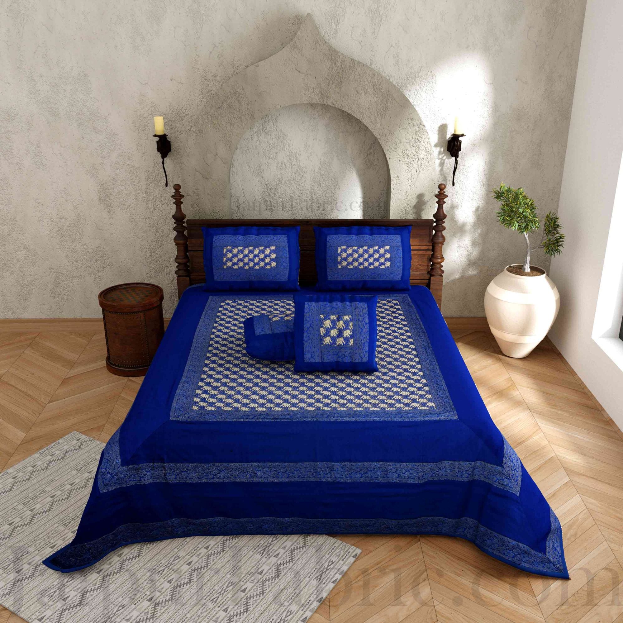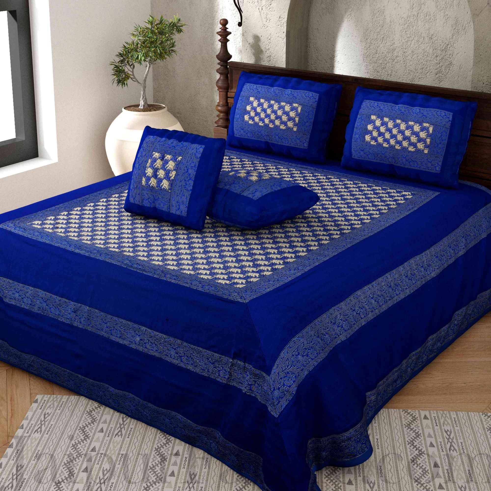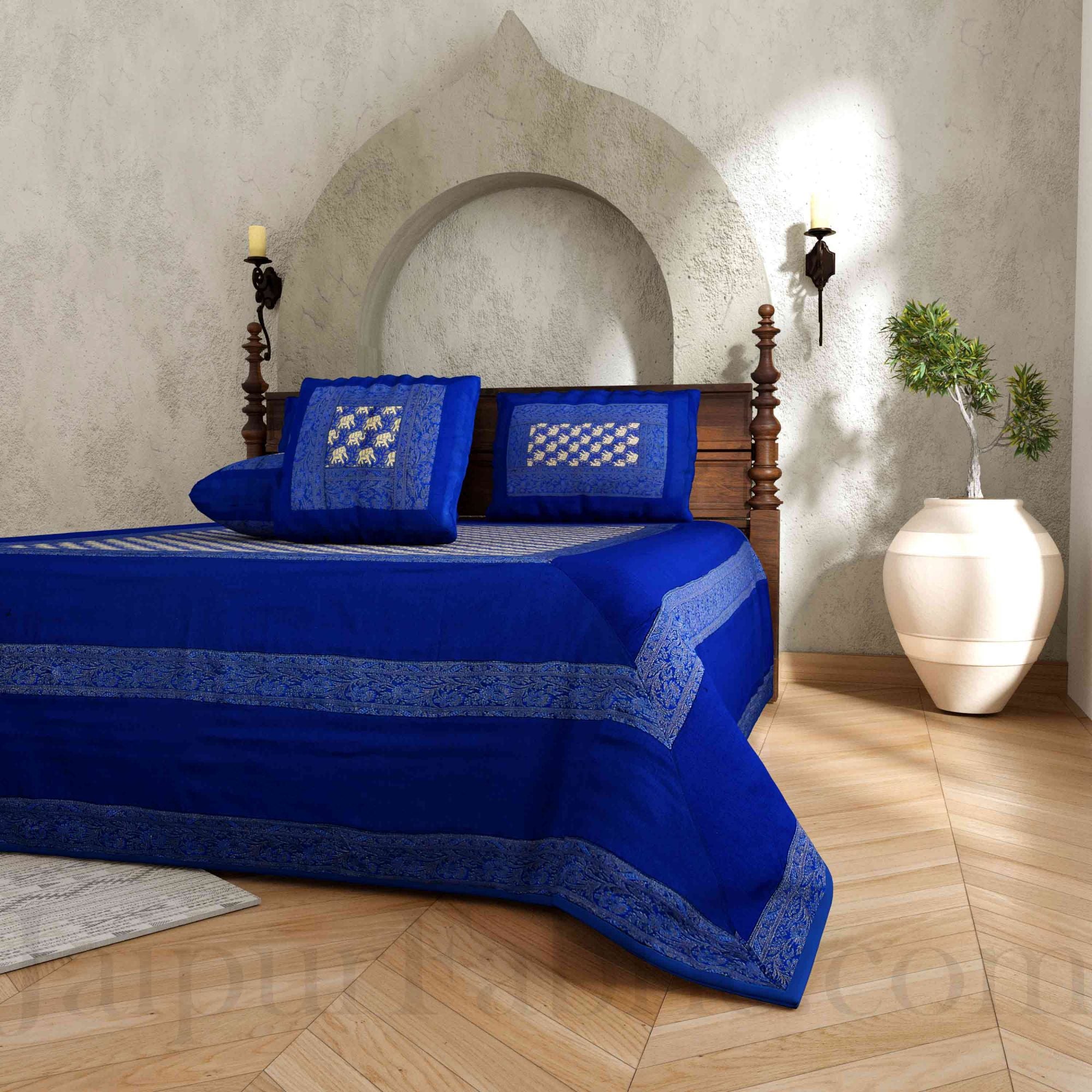 Add a touch of Rajasthan's royal charm to your home with this Blue Rajasthani Zari Embroidered Lace Elephant Thread Work Silk Double Bed Sheet. Perfect for creating an opulent atmosphere, it’s a must-have for lovers of traditional craftsmanship. 🌟💙