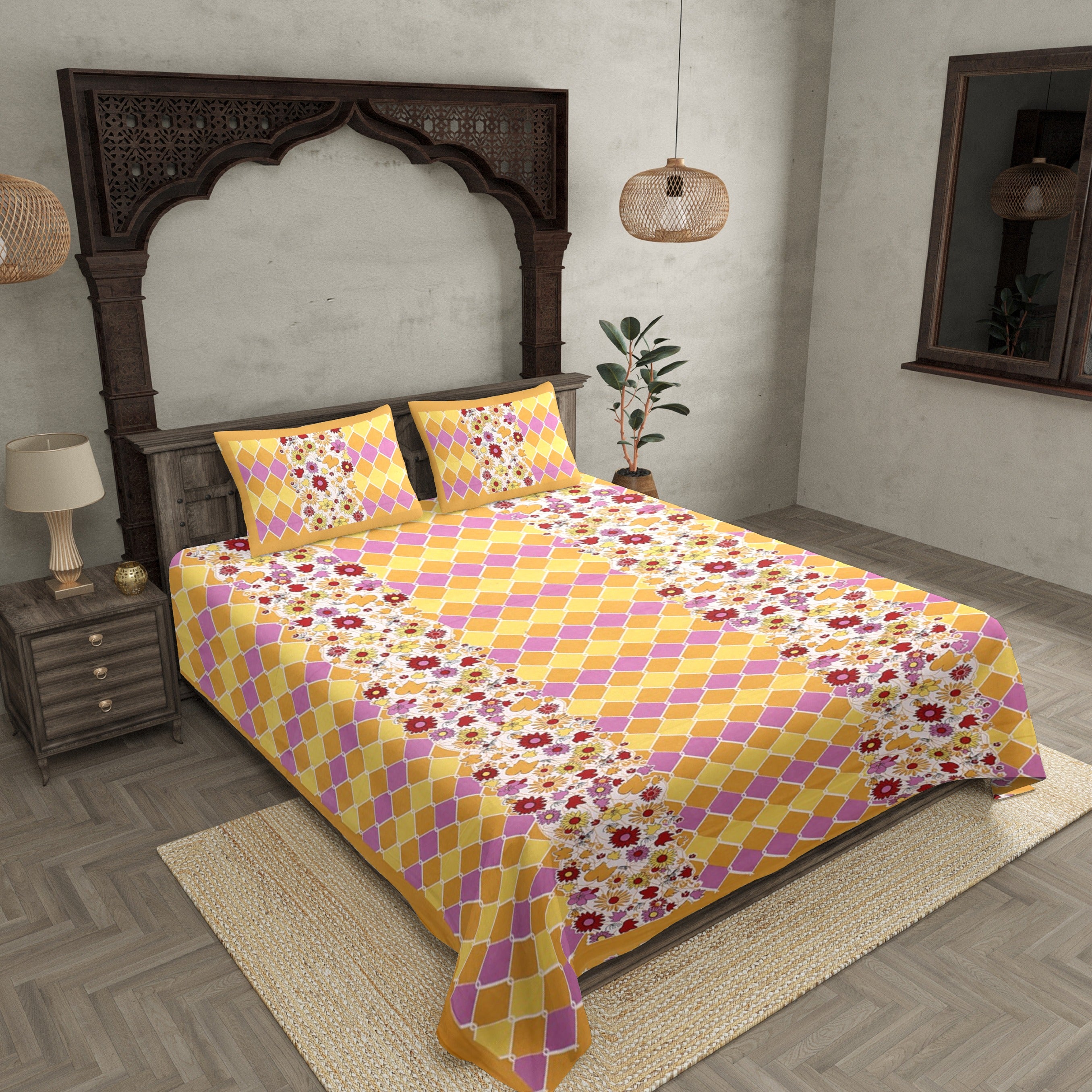 Enhance your bedroom with the cheerful and vibrant Floral Double Bedsheet with Yellow Border – where elegance meets comfort! 🌸🛏️