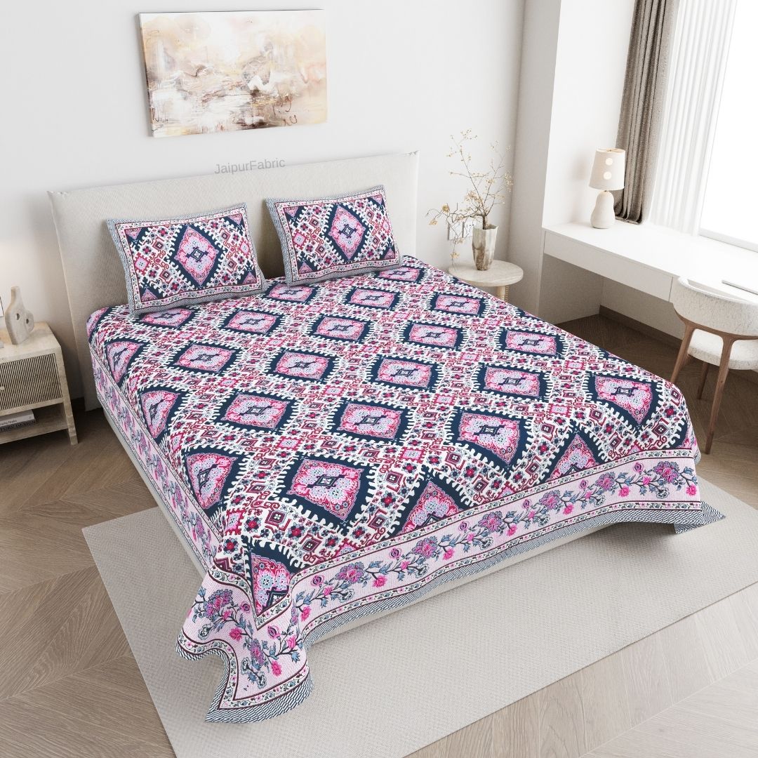Geometric Ikat Mosaic Pink Navy Double Bedsheet Pure Cotton