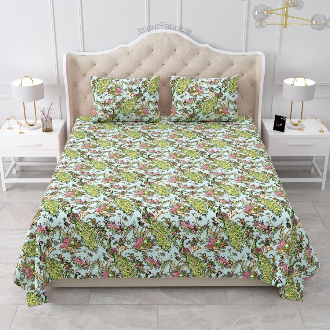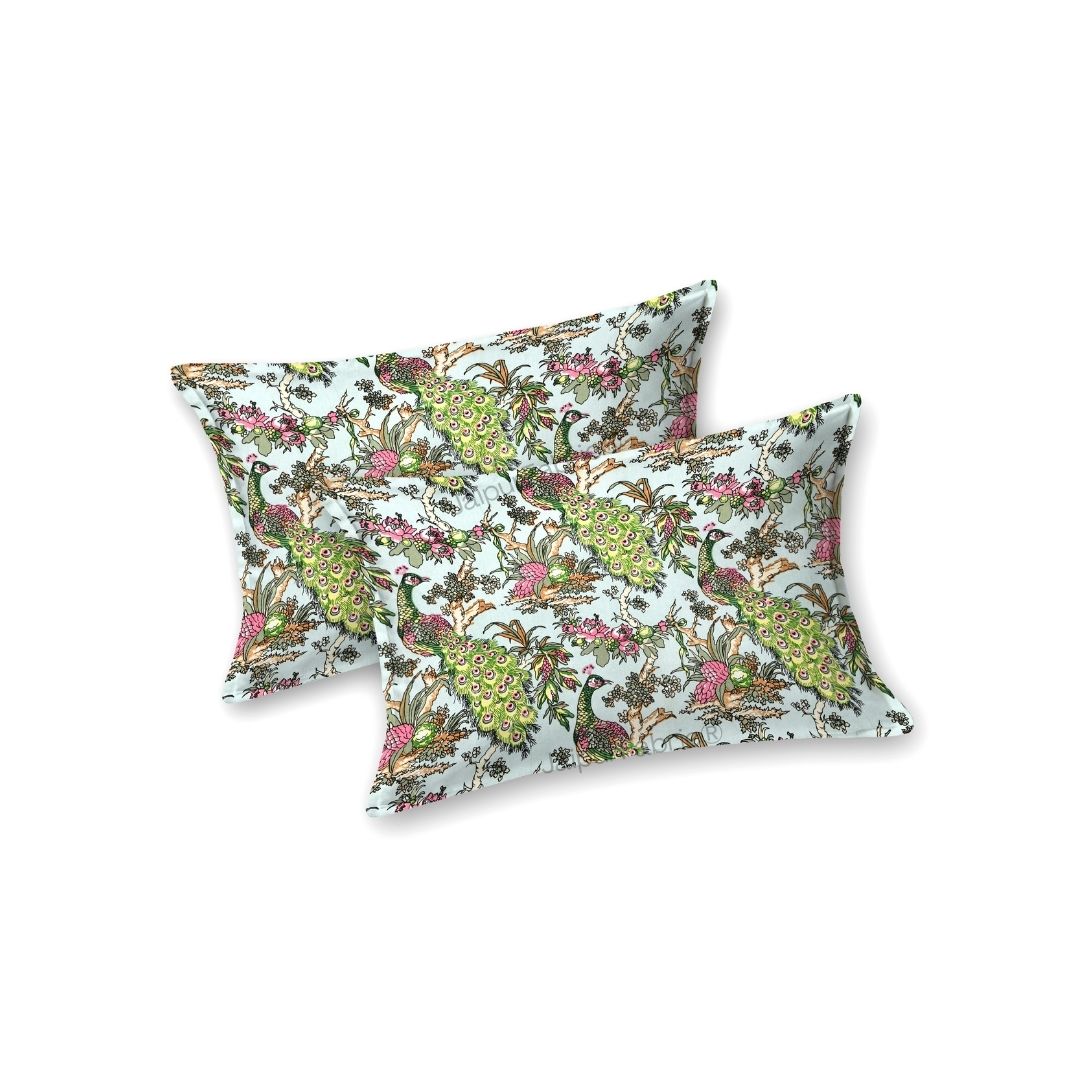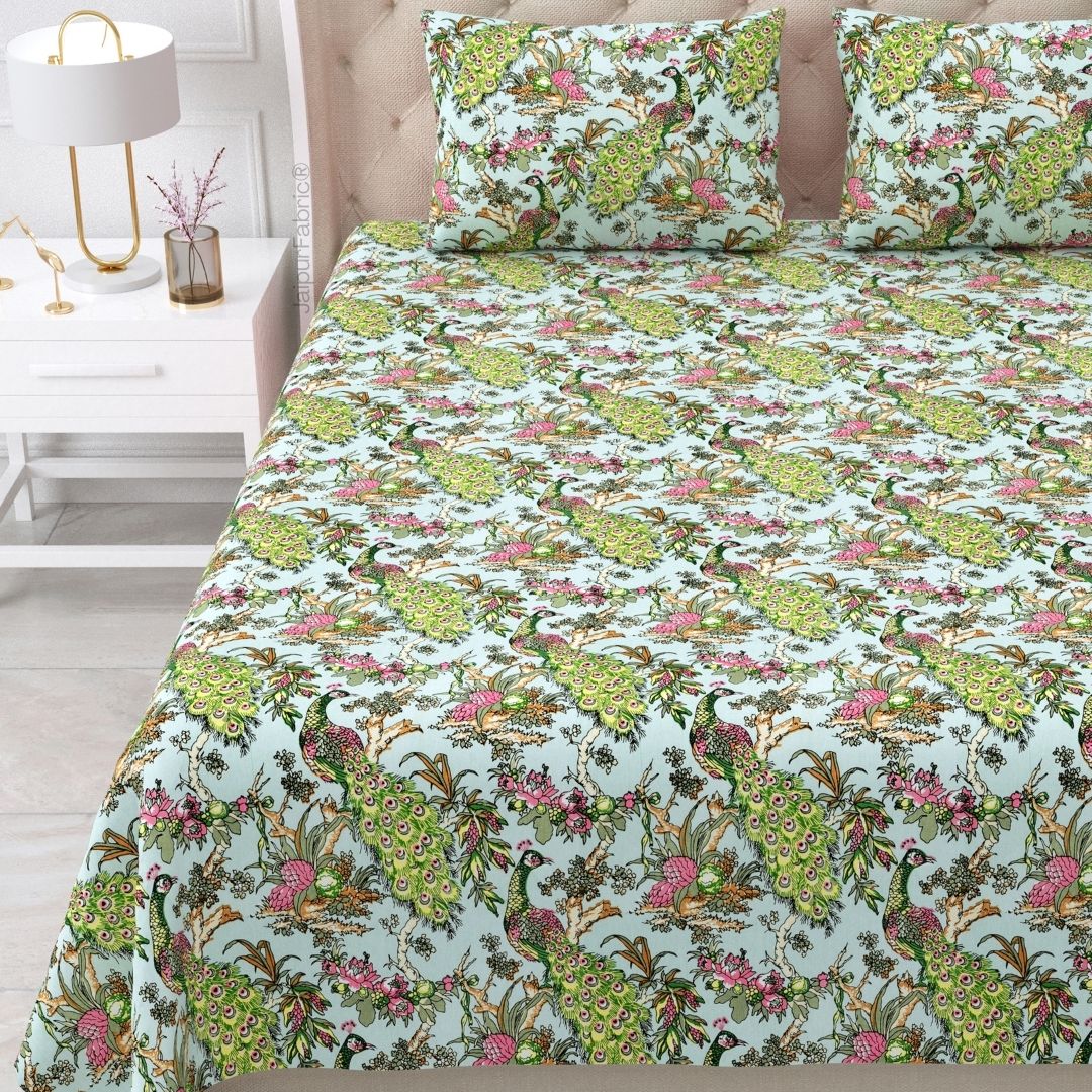 Where cool waters kiss blooming gardens and peacocks glide with grace, the Mayura Royal Feather Aqua Blossom Bedsheet takes root. This bedsheet is a tribute to serenity, renewal, and regal artistry, blending the refreshing calm of aqua tones with nature’s delicate blooms.