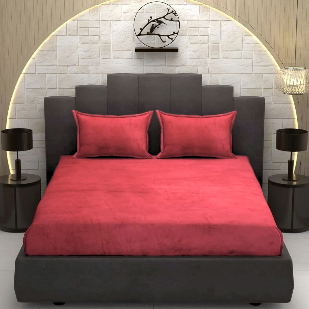Red Super Soft Velvet Double Bedsheet with Matching Pillow Covers